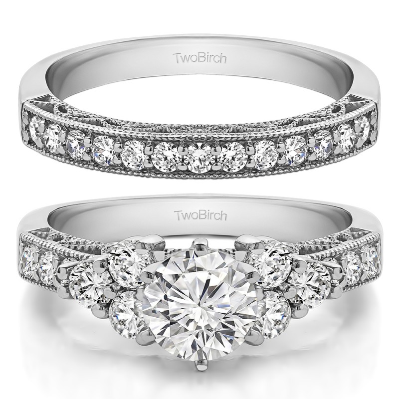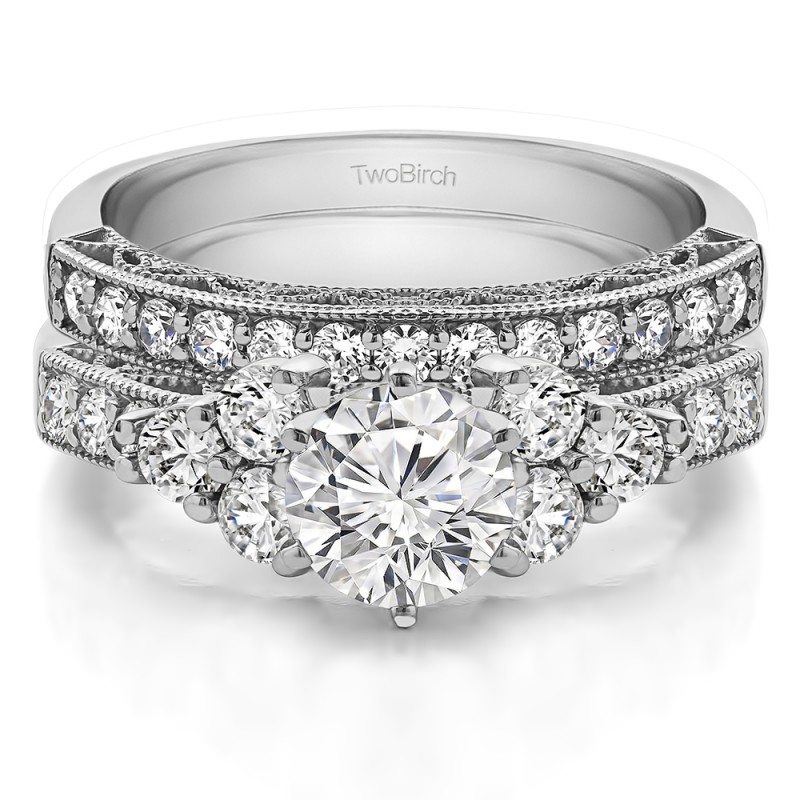 This TwoBirch bridal set features two rings: an engagement ring and matching wedding band. Every bridal set we sell is made with conflict free and eco-conscious metals and stones. This engagement ring features a Round center stone, surrounded by 12 side stones. The engagement ring has a 1 carat center stone, and 0.71 carats of side stones, giving the engagement ring a total weight of 1.71 carats. The matching wedding band in this set has 13 stones with a total weight of 0.325 carats. This bridal set has a total combined weight of 2.035 carats. If you would like to purchase just the engagement ring in this set, please search for TB-ENG-254-J8L in the search bar above. This set is available in many variations of gold, as well as moissanite, diamonds, or even as a mounting with no center stone. Please make selections from the drop down menus.