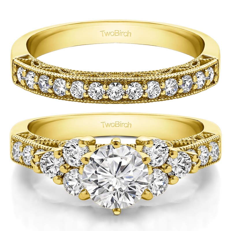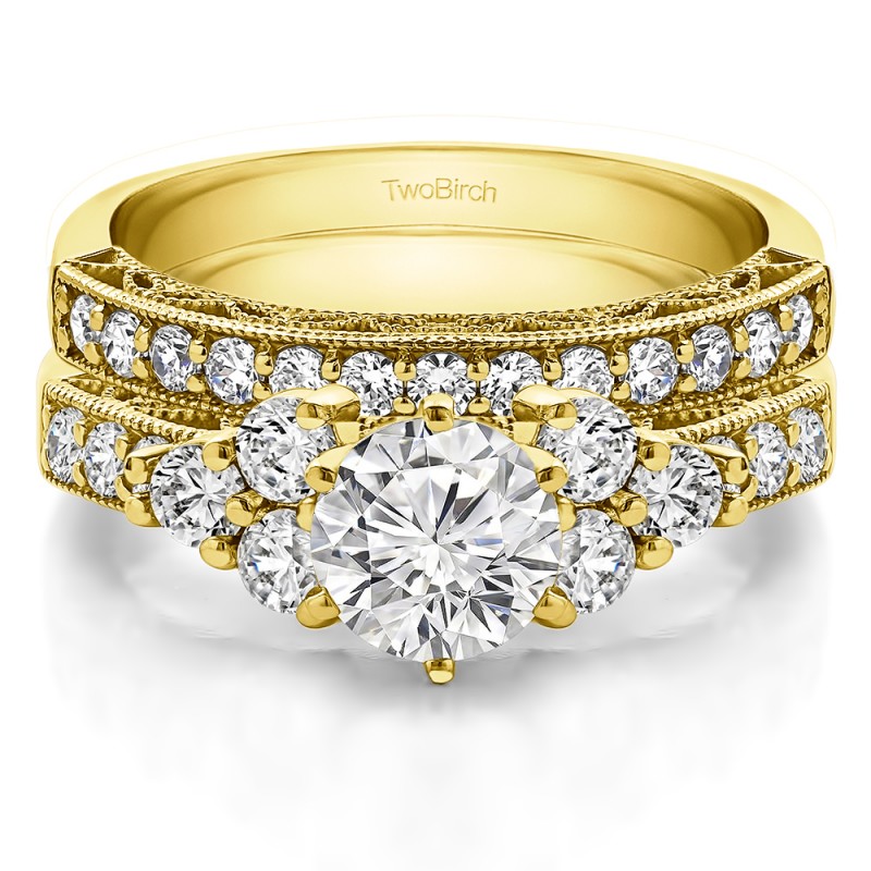 This TwoBirch bridal set features two rings: an engagement ring and matching wedding band. Every bridal set we sell is made with conflict free and eco-conscious metals and stones. This engagement ring features a Round center stone, surrounded by 12 side stones. The engagement ring has a 1 carat center stone, and 0.71 carats of side stones, giving the engagement ring a total weight of 1.71 carats. The matching wedding band in this set has 13 stones with a total weight of 0.325 carats. This bridal set has a total combined weight of 2.035 carats. If you would like to purchase just the engagement ring in this set, please search for TB-ENG-254-J8L in the search bar above. This set is available in many variations of gold, as well as moissanite, diamonds, or even as a mounting with no center stone. Please make selections from the drop down menus.