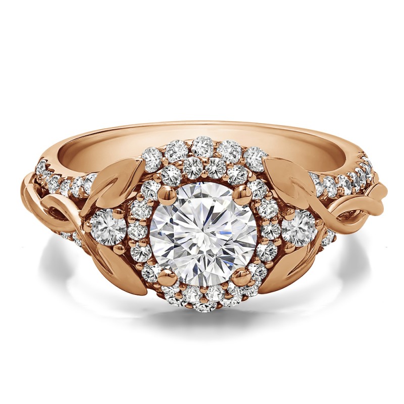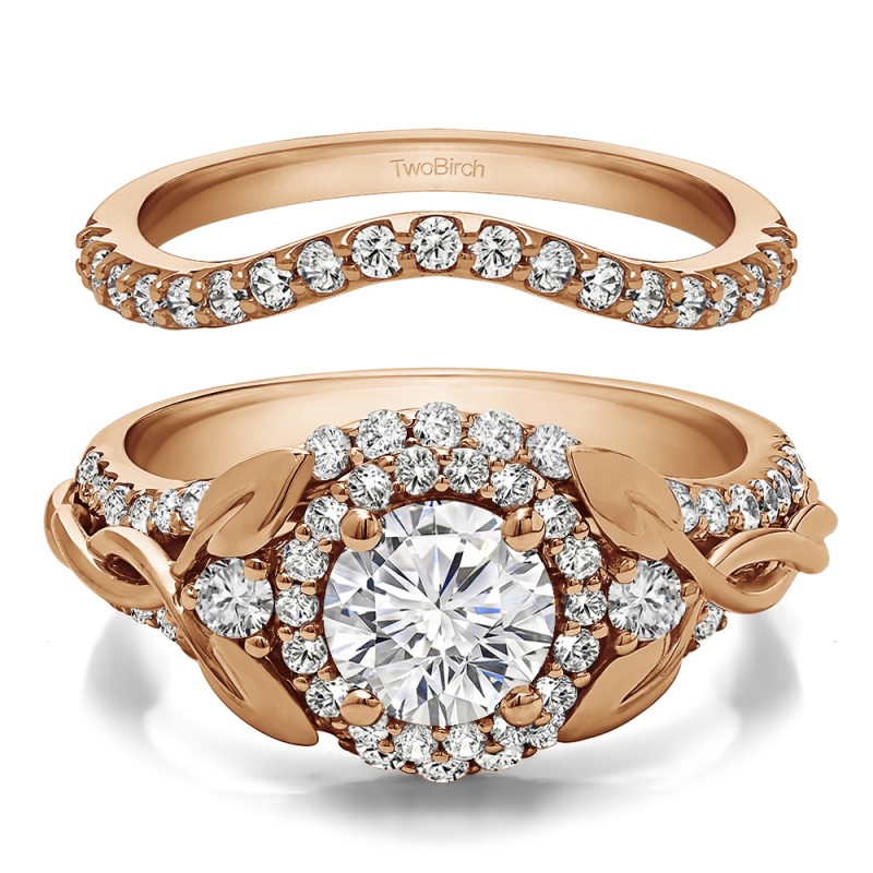 This TwoBirch bridal set features two rings: an engagement ring and matching wedding band. Every bridal set we sell is made with conflict free and eco-conscious metals and stones. This engagement ring features a Round center stone, surrounded by 66 side stones. The engagement ring has a 1 carat center stone, and 0.81 carats of side stones, giving the engagement ring a total weight of 1.81 carats. The matching wedding band in this set has 19 stones with a total weight of 0.29 carats. This bridal set has a total combined weight of 2.1 carats. If you would like to purchase just the engagement ring in this set, please search for TB-ENG-265-K8L in the search bar above. This set is available in many variations of gold, as well as moissanite, diamonds, or even as a mounting with no center stone. Please make selections from the drop down menus.