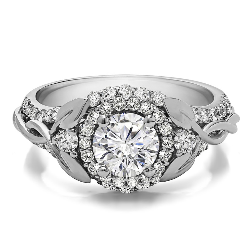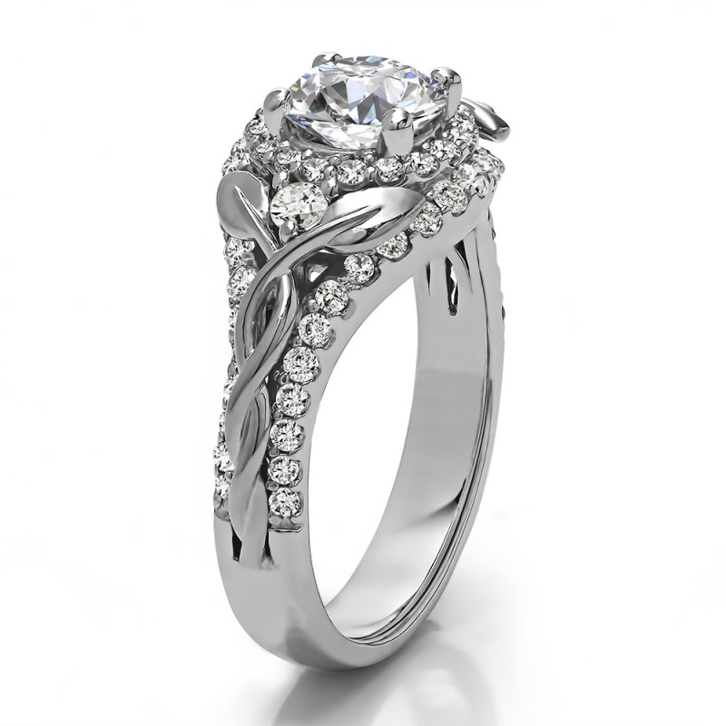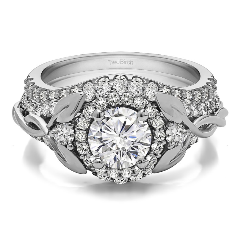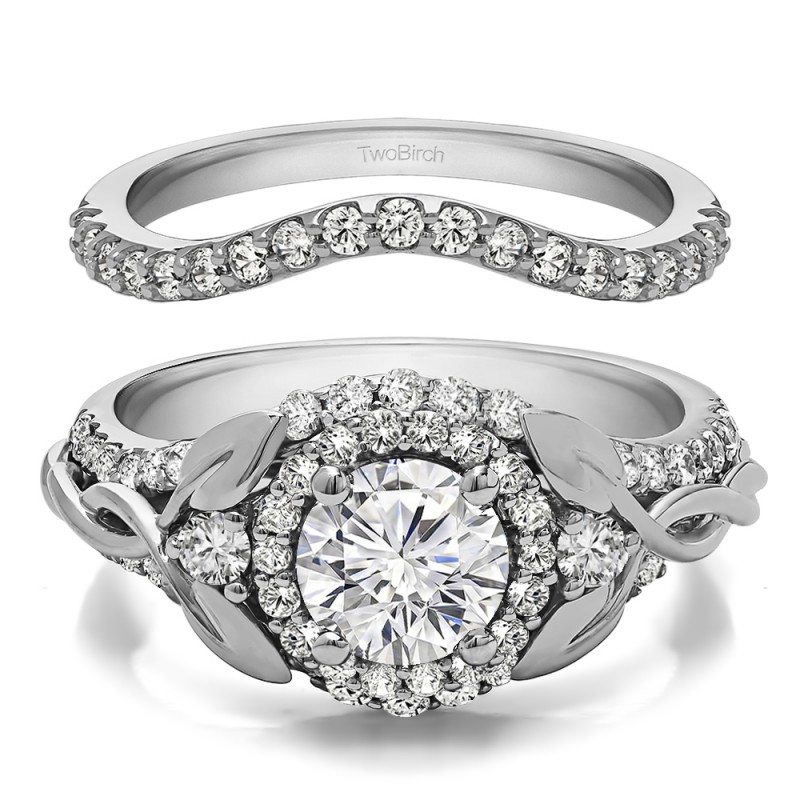 This TwoBirch bridal set features two rings: an engagement ring and matching wedding band. Every bridal set we sell is made with conflict free and eco-conscious metals and stones. This engagement ring features a Round center stone, surrounded by 66 side stones. The engagement ring has a 1 carat center stone, and 0.81 carats of side stones, giving the engagement ring a total weight of 1.81 carats. The matching wedding band in this set has 19 stones with a total weight of 0.29 carats. This bridal set has a total combined weight of 2.1 carats. If you would like to purchase just the engagement ring in this set, please search for TB-ENG-265-K8L in the search bar above. This set is available in many variations of gold, as well as moissanite, diamonds, or even as a mounting with no center stone. Please make selections from the drop down menus.