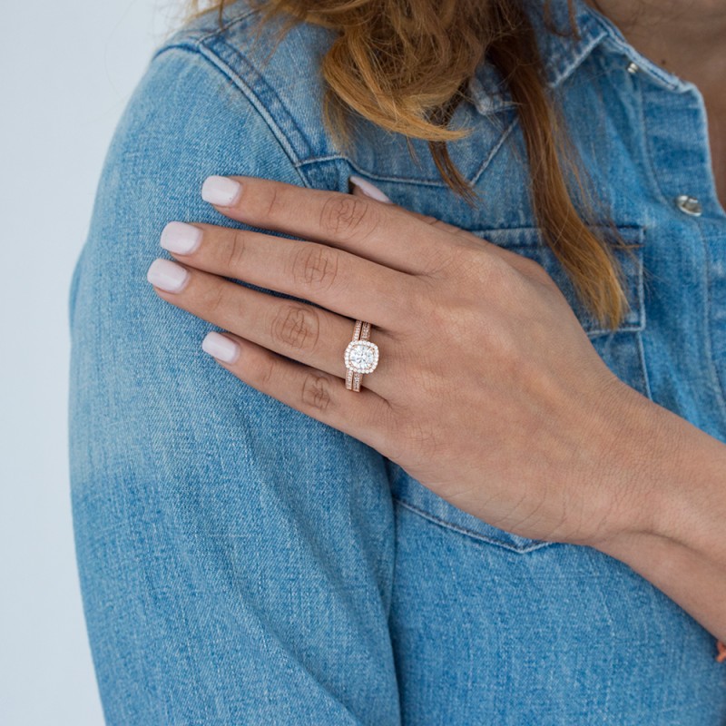 This TwoBirch bridal set features two rings: an engagement ring and matching wedding band. Every bridal set we sell is made with conflict free and eco-conscious metals and stones. This engagement ring features a Round center stone, surrounded by 46 side stones. The engagement ring has a 1.5 carat center stone, and 0.35 carats of side stones, giving the engagement ring a total weight of 1.85 carats. The matching wedding band in this set has 28 stones with a total weight of 0.14 carats. This bridal set has a total combined weight of 1.99 carats. If you would like to purchase just the engagement ring in this set, please search for TB-ENG-349-FN in the search bar above. This set is available in many variations of gold, as well as moissanite, diamonds, or even as a mounting with no center stone. Please make selections from the drop down menus.