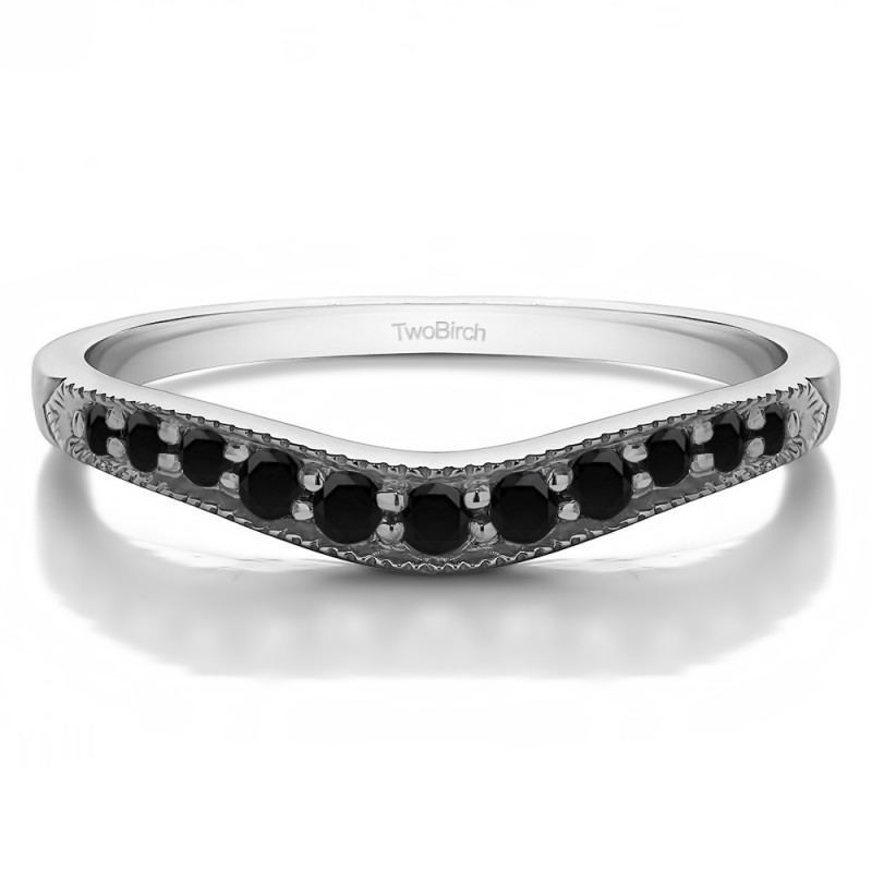 This curved wedding ring features 11 round, prong set stones with 0.2 carats in total. The ring is 2 millimeters wide and weighs approximately 2.72 grams. This contour band is made to fit a round solitaire from 0.25 carats up to 0.5 carats, a marquise solitaire from 0.25 carats up to 1 carats, or a princess cut solitaire from 0.25 carats up to 0.75 carats. Curved rings are perfect for most style engagement rings. If you are unsure what will fit with your engagement ring, please add Virtual Fit onto your order so we can email you images of our ring with yours for approval before shipping.