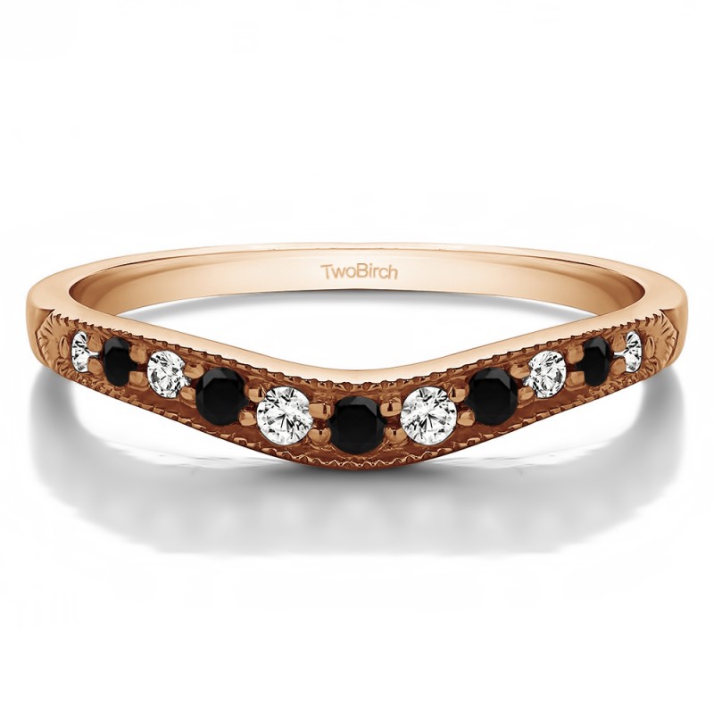 This curved wedding ring features 11 round, prong set stones with 0.2 carats in total. The ring is 2 millimeters wide and weighs approximately 2.72 grams. This contour band is made to fit a round, princess or marquise solitaire from 0.5 carats up to 1.5 carats. Curved rings are perfect for most style engagement rings. If you are unsure what will fit with your engagement ring, please add Virtual Fit onto your order so we can email you images of our ring with yours for approval before shipping.