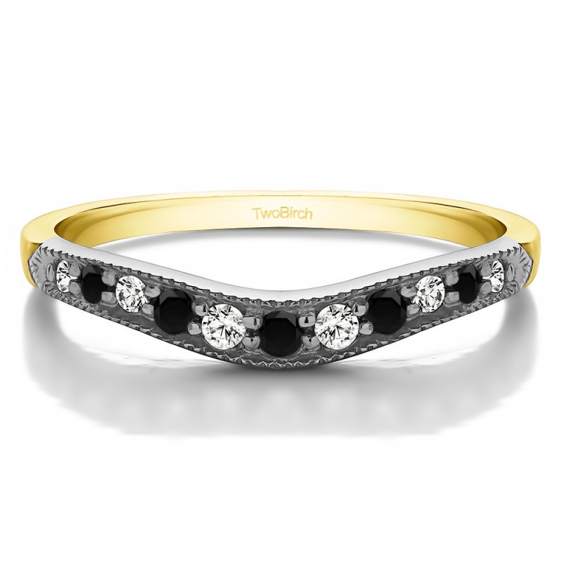 This curved wedding ring features 11 round, prong set stones with 0.2 carats in total. The ring is 2 millimeters wide and weighs approximately 2.72 grams. This contour band is made to fit a round, princess or marquise solitaire from 0.5 carats up to 1.5 carats. Curved rings are perfect for most style engagement rings. If you are unsure what will fit with your engagement ring, please add Virtual Fit onto your order so we can email you images of our ring with yours for approval before shipping.