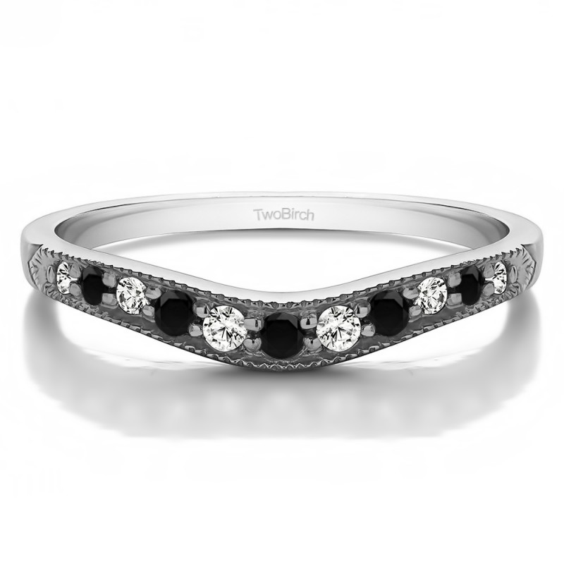 This curved wedding ring features 11 round, prong set stones with 0.2 carats in total. The ring is 2 millimeters wide and weighs approximately 2.72 grams. This contour band is made to fit a round, princess or marquise solitaire from 0.5 carats up to 1.5 carats. Curved rings are perfect for most style engagement rings. If you are unsure what will fit with your engagement ring, please add Virtual Fit onto your order so we can email you images of our ring with yours for approval before shipping.