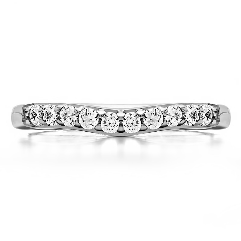This curved wedding ring features 10 round, prong set stones with 0.25 carats in total. The ring is 2 millimeters wide and weighs approximately 3.55 grams. This contour band is made to fit a round, princess or marquise solitaire from 0.5 carats up to 1.5 carats. Curved rings are perfect for most style engagement rings. If you are unsure what will fit with your engagement ring, please add Virtual Fit onto your order so we can email you images of our ring with yours for approval before shipping.