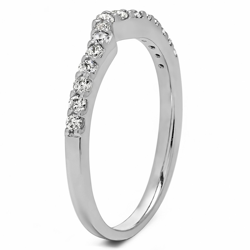 This curved wedding ring features 15 round, prong set stones with 0.25 carats in total. The ring is 2 millimeters wide and weighs approximately 2.16 grams. This contour band is made to fit a round, princess or marquise solitaire from 0.5 carats up to 1.5 carats. Curved rings are perfect for most style engagement rings. If you are unsure what will fit with your engagement ring, please add Virtual Fit onto your order so we can email you images of our ring with yours for approval before shipping.