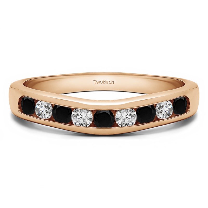 This curved wedding ring features 9 round, channel set stones with 0.5 carats in total. The ring is 2 millimeters wide and weighs approximately 4.14 grams. This contour band is made to fit a round, princess or marquise solitaire from 0.5 carats up to 1.5 carats. Curved rings are perfect for most style engagement rings. If you are unsure what will fit with your engagement ring, please add Virtual Fit onto your order so we can email you images of our ring with yours for approval before shipping.