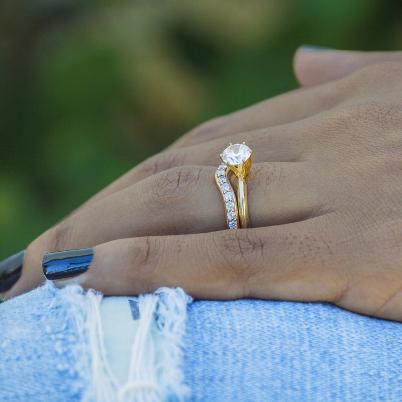 This curved wedding ring features 15 round, prong set stones with 0.5 carats in total. The ring is 2 millimeters wide and weighs approximately 4.07 grams. a round, princess or marquise cut solitaire from 0.5 carats up to 2 carats. Curved rings are perfect for most style engagement rings. If you are unsure what will fit with your engagement ring, please add Virtual Fit onto your order so we can email you images of our ring with yours for approval before shipping.