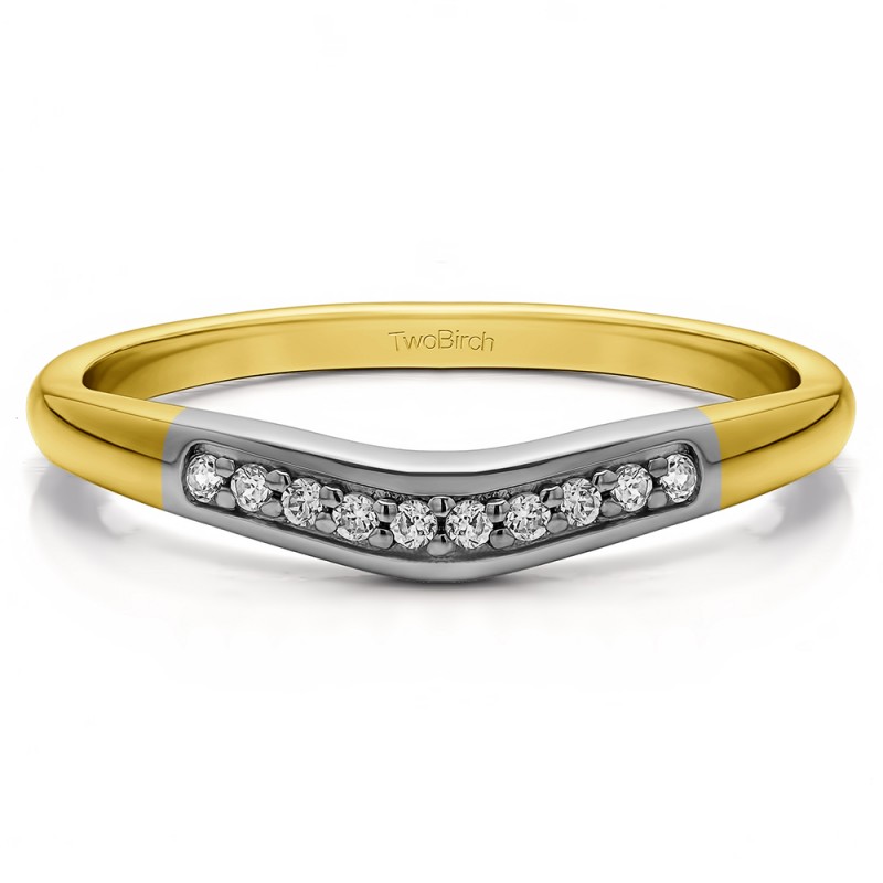 This curved wedding ring features 10 round, prong set stones with 0.1 carats in total. The ring is 2 millimeters wide and weighs approximately 3.18 grams. This contour band is made to fit a round solitaire from 0.5 carats up to 1 carats, a marquise solitaire from 0.25 carats up to 1 carats, or a princess cut solitaire from 0.5 carats up to 0.75 carats. Curved rings are perfect for most style engagement rings. If you are unsure what will fit with your engagement ring, please add Virtual Fit onto your order so we can email you images of our ring with yours for approval before shipping.