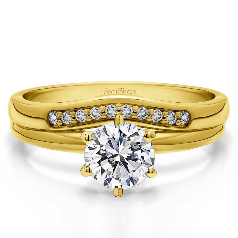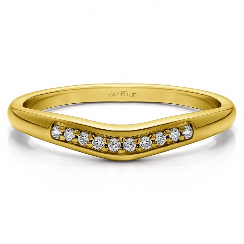 This curved wedding ring features 10 round, prong set stones with 0.1 carats in total. The ring is 2 millimeters wide and weighs approximately 3.18 grams. This contour band is made to fit a round solitaire from 0.5 carats up to 1 carats, a marquise solitaire from 0.25 carats up to 1 carats, or a princess cut solitaire from 0.5 carats up to 0.75 carats. Curved rings are perfect for most style engagement rings. If you are unsure what will fit with your engagement ring, please add Virtual Fit onto your order so we can email you images of our ring with yours for approval before shipping.