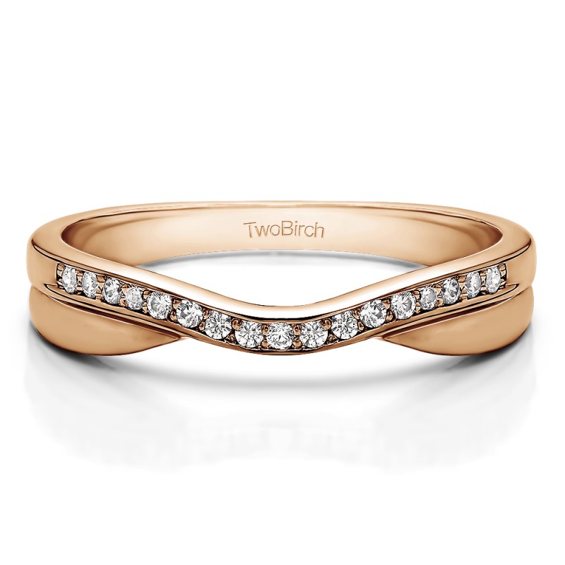 This curved wedding ring features 17 round, prong set stones with 0.11 carats in total. The ring is 2 millimeters wide and weighs approximately 4.04 grams. This contour band is made to fit a round or marquise solitaire from 1/2 carat up to 2 carats or a princess solitaire from 1/2 carat to 3/4 carat. Curved rings are perfect for most style engagement rings. If you are unsure what will fit with your engagement ring, please add Virtual Fit onto your order so we can email you images of our ring with yours for approval before shipping.