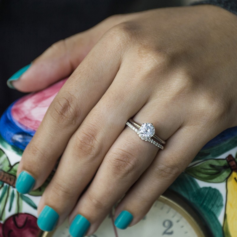 This curved wedding ring features 15 round, prong set stones with 0.15 carats in total. The ring is 2 millimeters wide and weighs approximately 2.16 grams. This contour band is made to fit a round solitaire from 0.5 carats up to 1 carats, a marquise solitaire from 0.25 carats up to 1 carats, or a princess cut solitaire from 0.5 carats up to 0.75 carats. Curved rings are perfect for most style engagement rings. If you are unsure what will fit with your engagement ring, please add Virtual Fit onto your order so we can email you images of our ring with yours for approval before shipping.