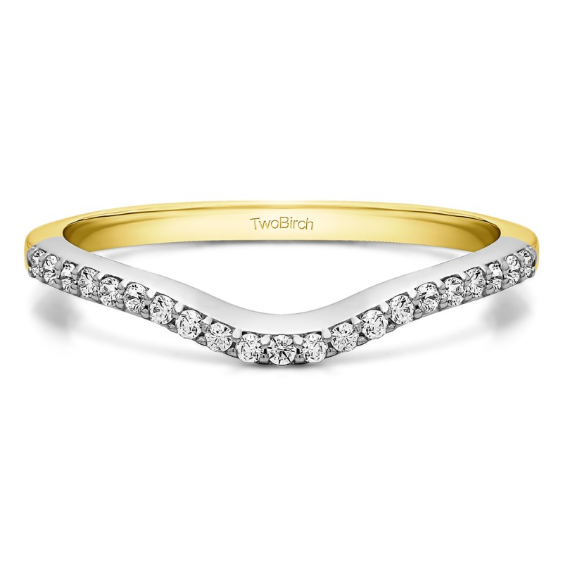 This curved wedding ring features 21 round, prong set stones with 0.16 carats in total. The ring is 2 millimeters wide and weighs approximately 2.72 grams. This contour band is made to fit a round or marquise solitaire from 1/2 carat up to 2 carats or a princess solitaire from 1/2 carat to 3/4 carat. Curved rings are perfect for most style engagement rings. If you are unsure what will fit with your engagement ring, please add Virtual Fit onto your order so we can email you images of our ring with yours for approval before shipping.