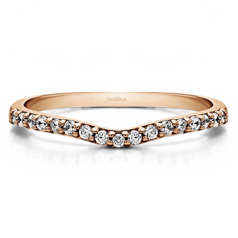 This curved wedding ring features 17 round, prong set stones with 0.17 carats in total. The ring is 2 millimeters wide and weighs approximately 2.08 grams. This contour band is made to fit a round or marquise solitaire from 1/2 carat up to 2 carats or a princess solitaire from 1/2 carat to 3/4 carat. Curved rings are perfect for most style engagement rings. If you are unsure what will fit with your engagement ring, please add Virtual Fit onto your order so we can email you images of our ring with yours for approval before shipping.