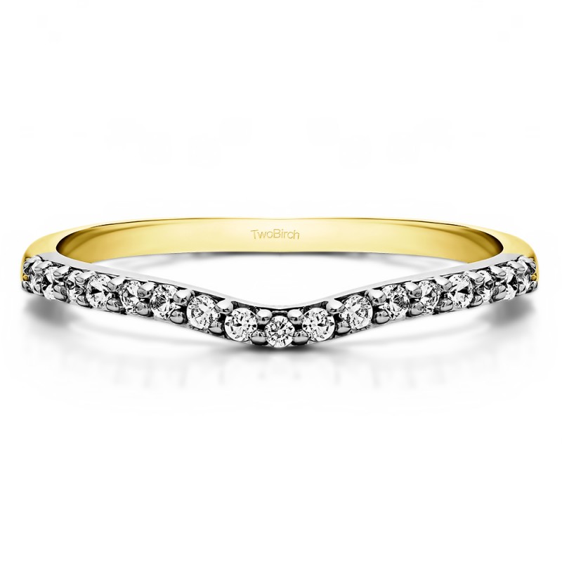 This curved wedding ring features 17 round, prong set stones with 0.17 carats in total. The ring is 2 millimeters wide and weighs approximately 2.08 grams. This contour band is made to fit a round or marquise solitaire from 1/2 carat up to 2 carats or a princess solitaire from 1/2 carat to 3/4 carat. Curved rings are perfect for most style engagement rings. If you are unsure what will fit with your engagement ring, please add Virtual Fit onto your order so we can email you images of our ring with yours for approval before shipping.