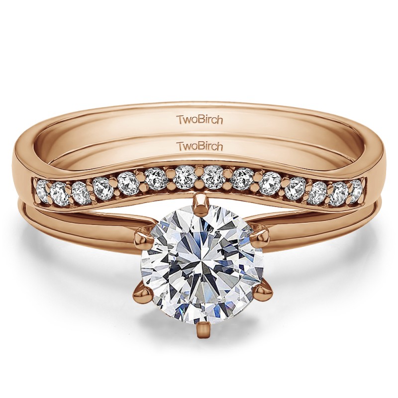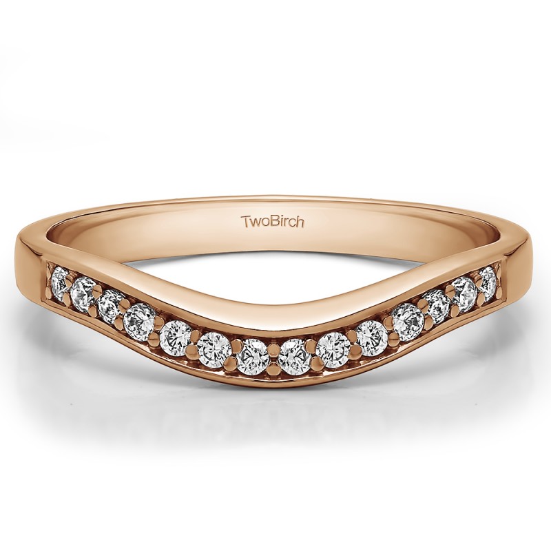 This curved wedding ring features 14 round, prong set stones with 0.18 carats in total. The ring is 2 millimeters wide and weighs approximately 4.16 grams. This contour band is made to fit a round or marquise solitaire from 1/2 carat up to 2 carats or a princess solitaire from 1/2 carat to 3/4 carat. Curved rings are perfect for most style engagement rings. If you are unsure what will fit with your engagement ring, please add Virtual Fit onto your order so we can email you images of our ring with yours for approval before shipping.
