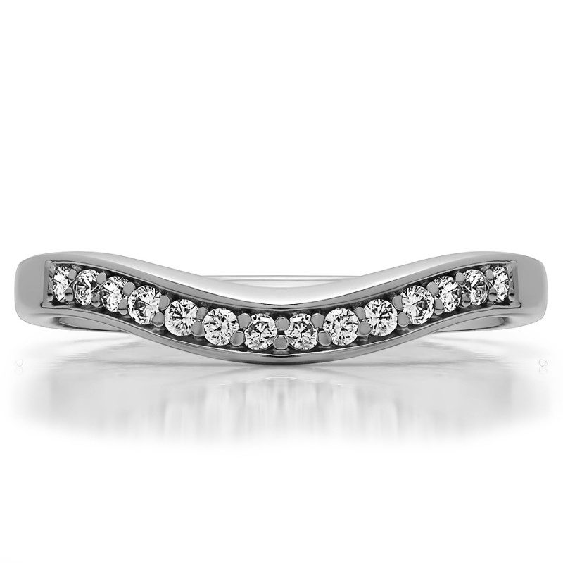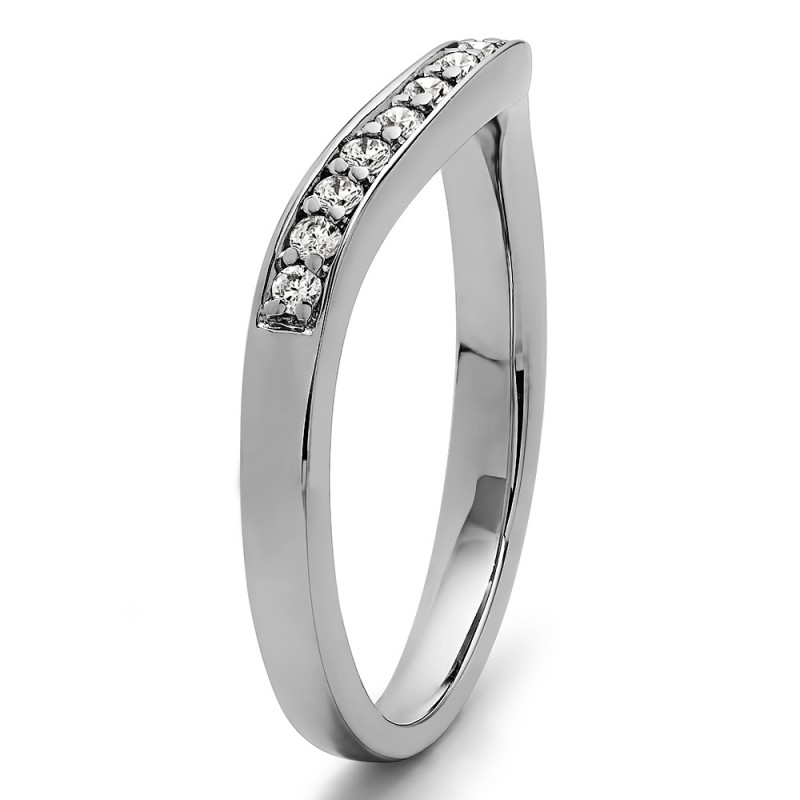 This curved wedding ring features 14 round, prong set stones with 0.18 carats in total. The ring is 2 millimeters wide and weighs approximately 4.16 grams. This contour band is made to fit a round or marquise solitaire from 1/2 carat up to 2 carats or a princess solitaire from 1/2 carat to 3/4 carat. Curved rings are perfect for most style engagement rings. If you are unsure what will fit with your engagement ring, please add Virtual Fit onto your order so we can email you images of our ring with yours for approval before shipping.