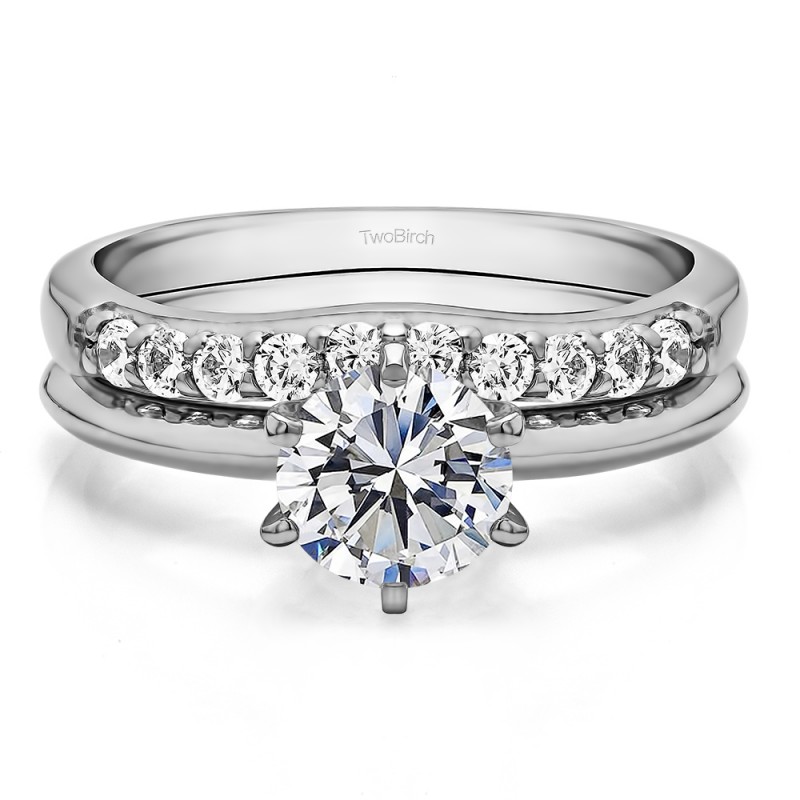 This curved wedding ring features 10 round, prong set stones with 0.25 carats in total. The ring is 2 millimeters wide and weighs approximately 3.55 grams. This contour band is made to fit a round or marquise solitaire from 1/2 carat up to 2 carats or a princess solitaire from 1/2 carat to 3/4 carat. Curved rings are perfect for most style engagement rings. If you are unsure what will fit with your engagement ring, please add Virtual Fit onto your order so we can email you images of our ring with yours for approval before shipping.