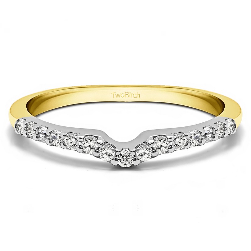 This curved wedding ring features 15 round, prong set stones with 0.25 carats in total. The ring is 2 millimeters wide and weighs approximately 2.16 grams. This contour band is made to fit a round solitaire from 0.5 carats up to 1 carats, a marquise solitaire from 0.25 carats up to 1 carats, or a princess cut solitaire from 0.5 carats up to 0.75 carats. Curved rings are perfect for most style engagement rings. If you are unsure what will fit with your engagement ring, please add Virtual Fit onto your order so we can email you images of our ring with yours for approval before shipping.
