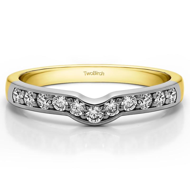 This curved wedding ring features 11 round, prong set stones with 0.33 carats in total. The ring is 2 millimeters wide and weighs approximately 3.68 grams. This contour band is made to fit a round or marquise solitaire from 1/2 carat up to 2 carats or a princess solitaire from 1/2 carat to 3/4 carat. Curved rings are perfect for most style engagement rings. If you are unsure what will fit with your engagement ring, please add Virtual Fit onto your order so we can email you images of our ring with yours for approval before shipping.