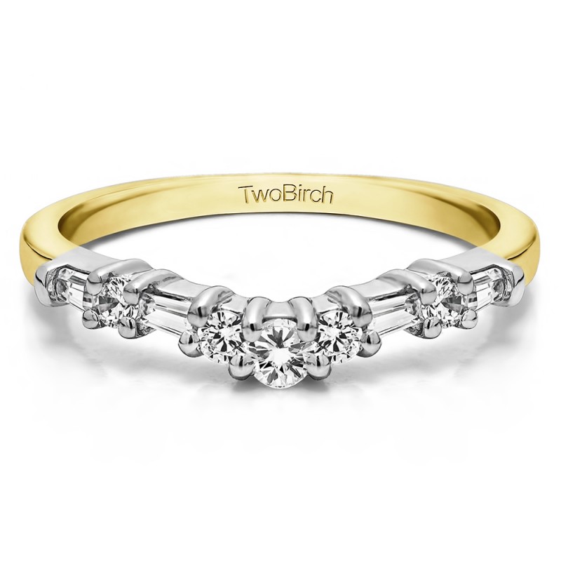 This curved wedding ring features a mix of prong set baguette and round stones. There are 9 stones with 0.35 carats in total weight. The ring is 2 millimeters wide and weighs approximately 2.89 grams. This contour band is made to fit a round solitaire from 0.5 carats up to 1 carats, a marquise solitaire from 0.25 carats up to 1 carats, or a princess cut solitaire from 0.5 carats up to 0.75 carats. Curved rings are perfect for most style engagement rings. If you are unsure what will fit with your engagement ring, please add Virtual Fit onto your order so we can email you images of our ring with yours for approval before shipping.