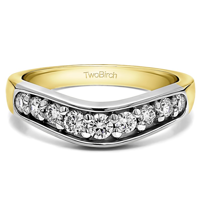 This curved wedding ring features 9 round, prong set stones with 0.42 carats in total. The ring is 2 millimeters wide and weighs approximately 4.93 grams. This contour band is made to fit a round solitaire from 0.5 carats up to 1 carats, a marquise solitaire from 0.25 carats up to 1 carats, or a princess cut solitaire from 0.5 carats up to 0.75 carats. Curved rings are perfect for most style engagement rings. If you are unsure what will fit with your engagement ring, please add Virtual Fit onto your order so we can email you images of our ring with yours for approval before shipping.