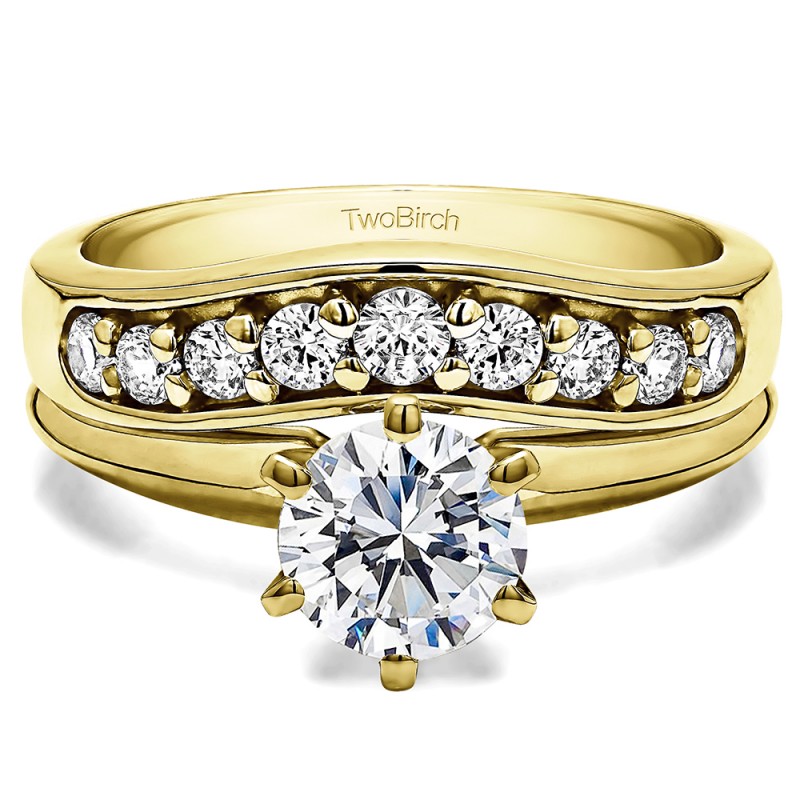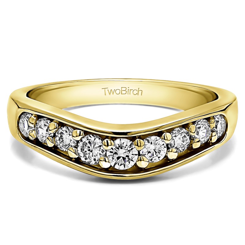 This curved wedding ring features 9 round, prong set stones with 0.42 carats in total. The ring is 2 millimeters wide and weighs approximately 4.93 grams. This contour band is made to fit a round solitaire from 0.5 carats up to 1 carats, a marquise solitaire from 0.25 carats up to 1 carats, or a princess cut solitaire from 0.5 carats up to 0.75 carats. Curved rings are perfect for most style engagement rings. If you are unsure what will fit with your engagement ring, please add Virtual Fit onto your order so we can email you images of our ring with yours for approval before shipping.