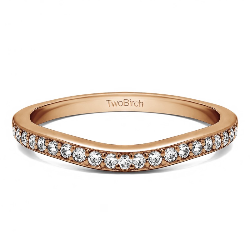This curved wedding ring features 21 round, prong set stones with 0.42 carats in total. The ring is 2 millimeters wide and weighs approximately 3.72 grams. This contour band is made to fit a round solitaire from 0.5 carats up to 1 carats, a marquise solitaire from 0.25 carats up to 1 carats, or a princess cut solitaire from 0.5 carats up to 0.75 carats. Curved rings are perfect for most style engagement rings. If you are unsure what will fit with your engagement ring, please add Virtual Fit onto your order so we can email you images of our ring with yours for approval before shipping.