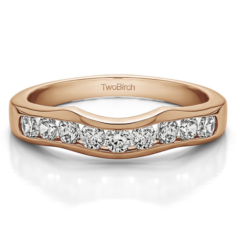 This curved wedding ring features 8 round, channel set stones with 0.48 carats in total. The ring is 2 millimeters wide and weighs approximately 4.25 grams. This contour band is made to fit a round solitaire from 0.5 carats up to 1 carats, a marquise solitaire from 0.25 carats up to 1 carats, or a princess cut solitaire from 0.5 carats up to 0.75 carats. Curved rings are perfect for most style engagement rings. If you are unsure what will fit with your engagement ring, please add Virtual Fit onto your order so we can email you images of our ring with yours for approval before shipping.