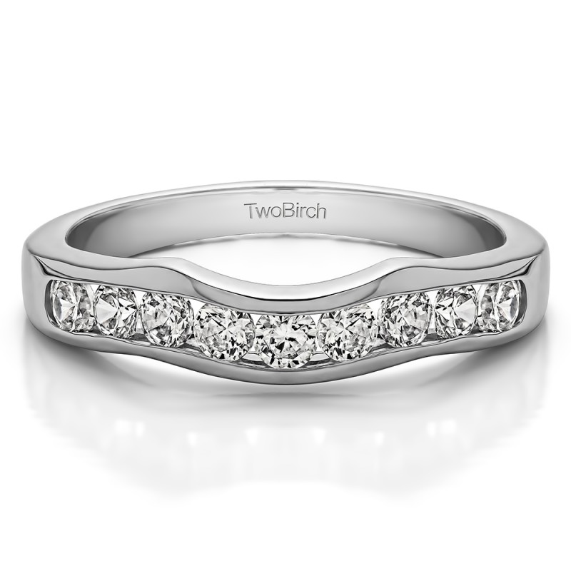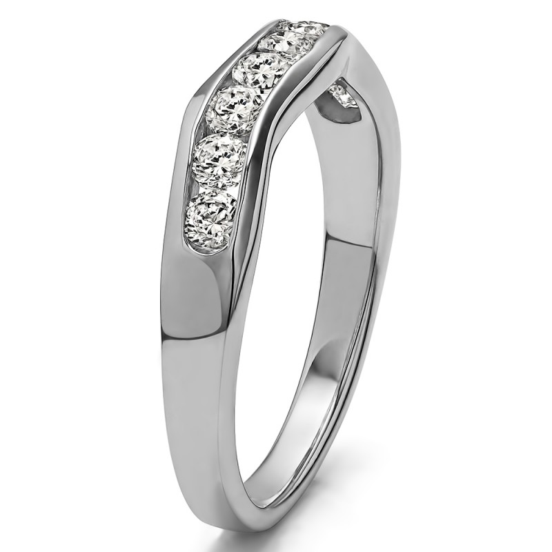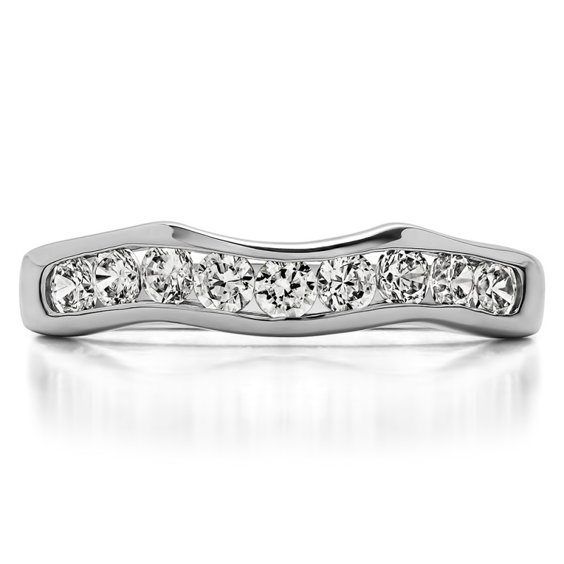 This curved wedding ring features 8 round, channel set stones with 0.48 carats in total. The ring is 2 millimeters wide and weighs approximately 4.25 grams. This contour band is made to fit a round solitaire from 0.5 carats up to 1 carats, a marquise solitaire from 0.25 carats up to 1 carats, or a princess cut solitaire from 0.5 carats up to 0.75 carats. Curved rings are perfect for most style engagement rings. If you are unsure what will fit with your engagement ring, please add Virtual Fit onto your order so we can email you images of our ring with yours for approval before shipping.