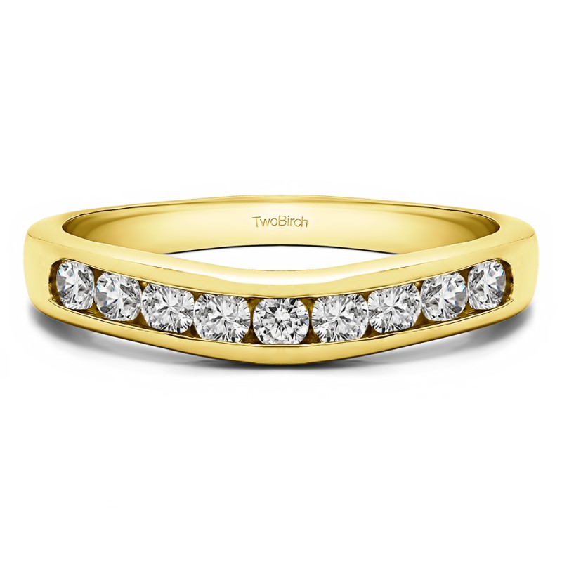 This curved wedding ring features 9 round, channel set stones with 0.5 carats in total. The ring is 2 millimeters wide and weighs approximately 4.14 grams. This contour band is made to fit a round or marquise solitaire from 1/2 carat up to 2 carats or a princess solitaire from 1/2 carat to 3/4 carat. Curved rings are perfect for most style engagement rings. If you are unsure what will fit with your engagement ring, please add Virtual Fit onto your order so we can email you images of our ring with yours for approval before shipping.