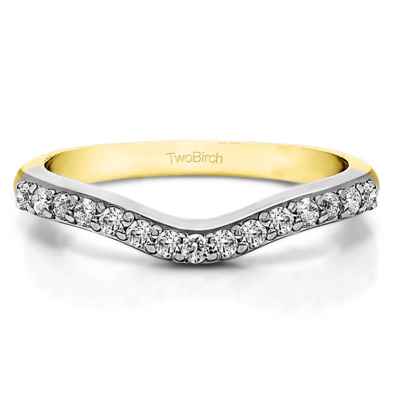 This curved wedding ring features 15 round, prong set stones with 0.5 carats in total. The ring is 2 millimeters wide and weighs approximately 4.07 grams. This contour band is made to fit a round solitaire from 0.5 carats up to 1 carats, a marquise solitaire from 0.25 carats up to 1 carats, or a princess cut solitaire from 0.5 carats up to 0.75 carats. Curved rings are perfect for most style engagement rings. If you are unsure what will fit with your engagement ring, please add Virtual Fit onto your order so we can email you images of our ring with yours for approval before shipping.