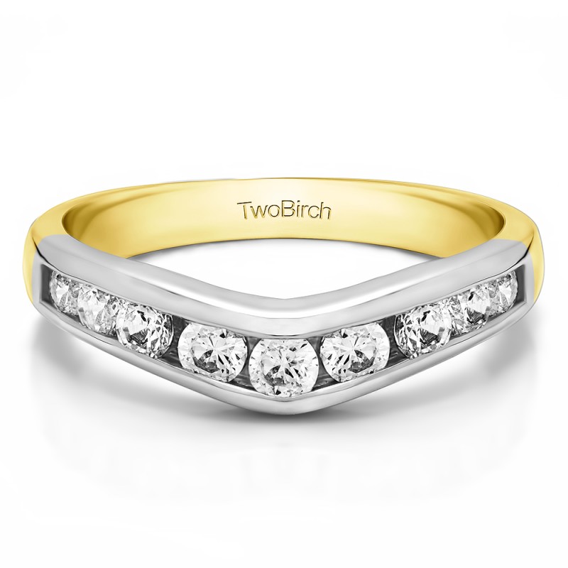 This curved wedding ring features 9 round, channel set stones with 1 carats in total. The ring is 2 millimeters wide and weighs approximately 5.23 grams. This contour band is made to fit a round or princess cut solitaire from 0.5 carats up to 1 carats, or a marquise solitaire from 0.25 carats up to 1 carat. Curved rings are perfect for most style engagement rings. If you are unsure what will fit with your engagement ring, please add Virtual Fit onto your order so we can email you images of our ring with yours for approval before shipping.