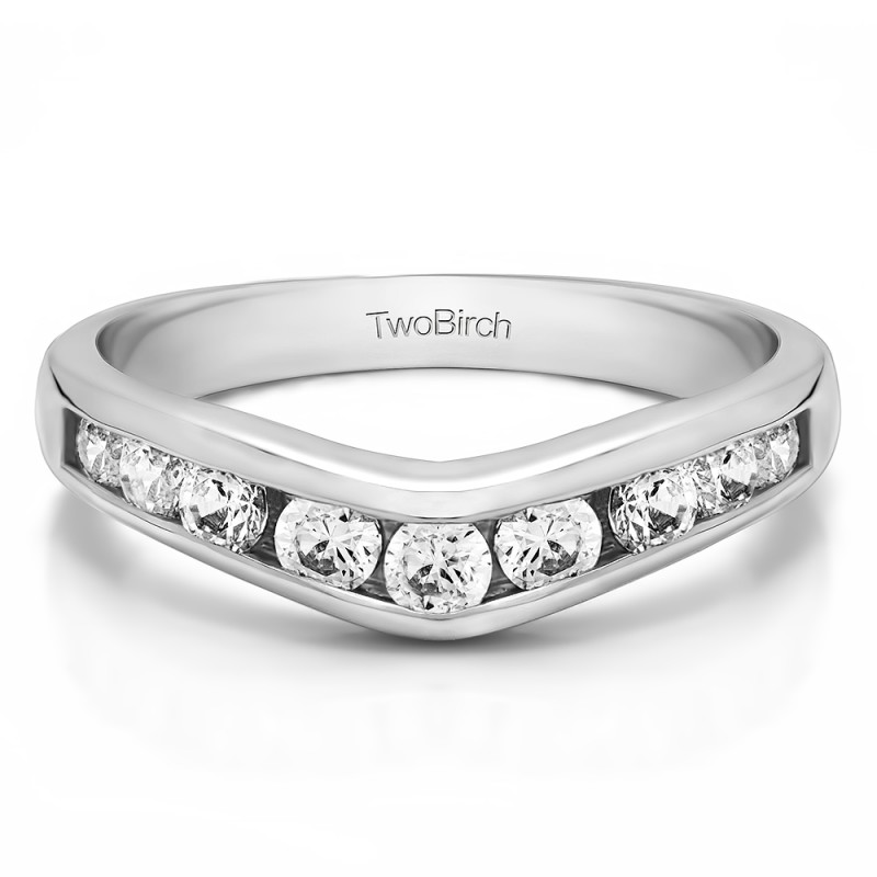 This curved wedding ring features 9 round, channel set stones with 1 carats in total. The ring is 2 millimeters wide and weighs approximately 5.23 grams. This contour band is made to fit a round or princess cut solitaire from 0.5 carats up to 1 carats, or a marquise solitaire from 0.25 carats up to 1 carat. Curved rings are perfect for most style engagement rings. If you are unsure what will fit with your engagement ring, please add Virtual Fit onto your order so we can email you images of our ring with yours for approval before shipping.