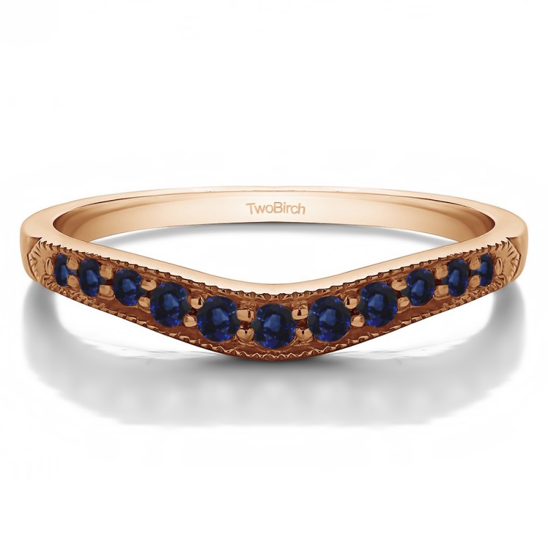 This curved wedding ring features 11 round, prong set stones with 0.2 carats in total. The ring is 2 millimeters wide and weighs approximately 2.72 grams. This contour band is made to fit a round solitaire from 0.5 carats up to 2 carats, a marquise solitaire from 0.25 carats up to 1 carats, or a princess cut solitaire from 0.5 carats up to 1 carats. Curved rings are perfect for most style engagement rings. If you are unsure what will fit with your engagement ring, please add Virtual Fit onto your order so we can email you images of our ring with yours for approval before shipping.