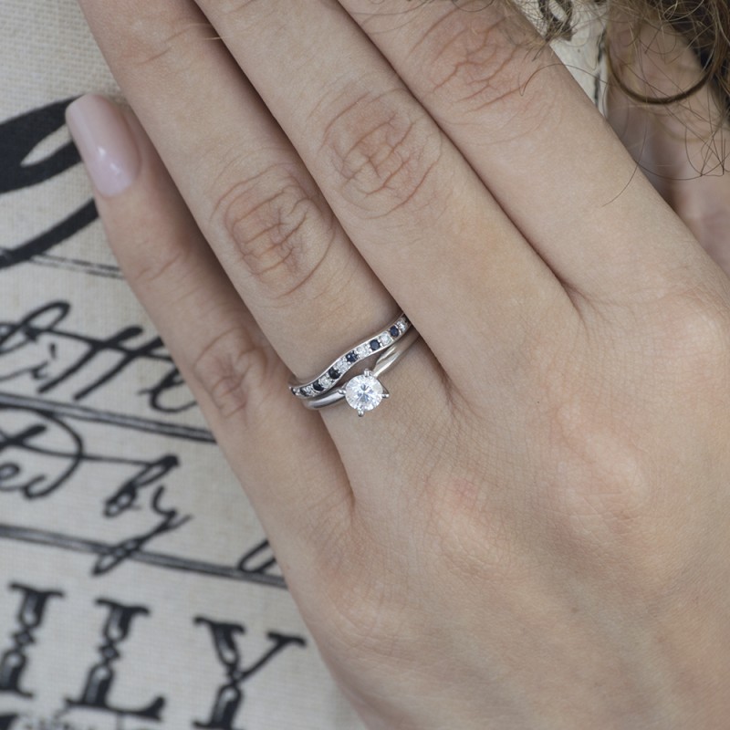 This curved wedding ring features 21 round, prong set stones with 0.25 carats in total. The ring is 2 millimeters wide and weighs approximately 3.04 grams. This contour band is made to fit a round, princess or marquise solitaire from 0.5 carats up to 1.5 carats. Curved rings are perfect for most style engagement rings. If you are unsure what will fit with your engagement ring, please add Virtual Fit onto your order so we can email you images of our ring with yours for approval before shipping.