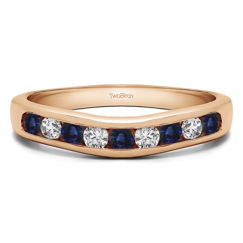 This curved wedding ring features 9 round, channel set stones with 0.5 carats in total. The ring is 2 millimeters wide and weighs approximately 4.14 grams. This contour band is made to fit a round or princess cut solitaire from 0.25 carats up to 1.5 carats, or a marquise solitaire from 0.25 carats up to 1 carat. Curved rings are perfect for most style engagement rings. If you are unsure what will fit with your engagement ring, please add Virtual Fit onto your order so we can email you images of our ring with yours for approval before shipping.