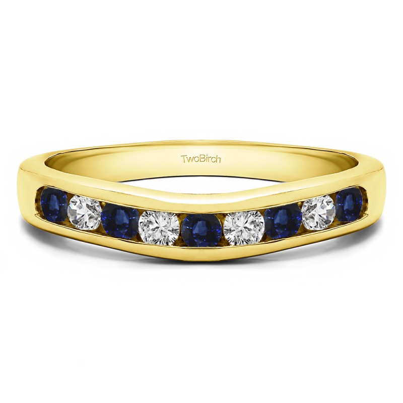 This curved wedding ring features 9 round, channel set stones with 0.5 carats in total. The ring is 2 millimeters wide and weighs approximately 4.14 grams. This contour band is made to fit a round or princess cut solitaire from 0.25 carats up to 1.5 carats, or a marquise solitaire from 0.25 carats up to 1 carat. Curved rings are perfect for most style engagement rings. If you are unsure what will fit with your engagement ring, please add Virtual Fit onto your order so we can email you images of our ring with yours for approval before shipping.