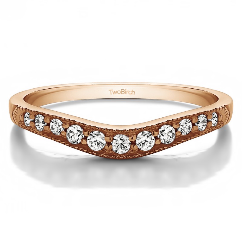 This curved wedding ring features 11 round, prong set stones with 0.2 carats in total. The ring is 2 millimeters wide and weighs approximately 2.72 grams. This contour band is made to fit a round or marquise solitaire from 1/2 carat up to 2 carats or a princess solitaire from 1/2 carat to 3/4 carat. Curved rings are perfect for most style engagement rings. If you are unsure what will fit with your engagement ring, please add Virtual Fit onto your order so we can email you images of our ring with yours for approval before shipping.