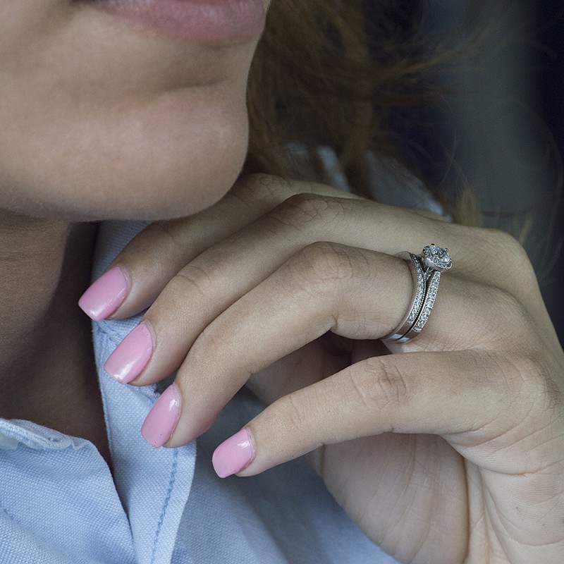 This wedding ring is made to match with the engagement ring below. If you already have an engagement ring, you can add PerfectFit onto your order. We will send you images of your engagment ring with our matching band. You can consider it a virtual ring fitting.