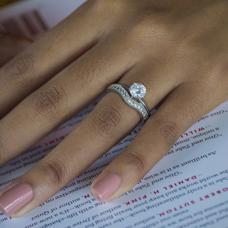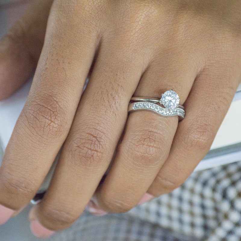 This curved wedding ring features 15 round, prong set stones with 0.24 carats in total. The ring is 2 millimeters wide and weighs approximately 4.31 grams. This contour band is made to fit a round solitaire from 0.5 carats up to 1 carats, a marquise solitaire from 0.25 carats up to 1 carats, or a princess cut solitaire from 0.5 carats up to 0.75 carats. Curved rings are perfect for most style engagement rings. If you are unsure what will fit with your engagement ring, please add Virtual Fit onto your order so we can email you images of our ring with yours for approval before shipping.