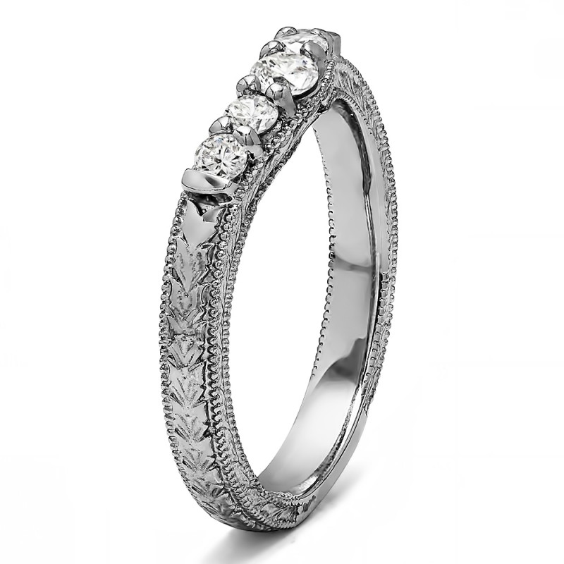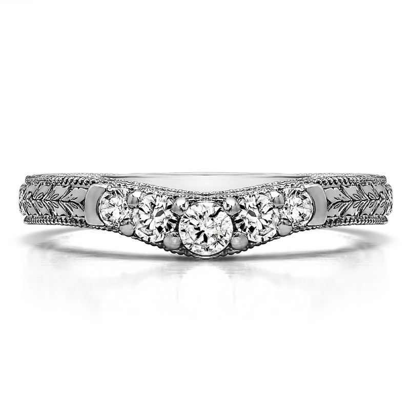 This curved wedding ring features 5 round, prong set stones with 0.33 carats in total. The ring is 2 millimeters wide and weighs approximately 4.75 grams. This contour band is made to fit a round or marquise solitaire from 1/2 carat up to 2 carats or a princess solitaire from 1/2 carat to 3/4 carat. Curved rings are perfect for most style engagement rings. If you are unsure what will fit with your engagement ring, please add Virtual Fit onto your order so we can email you images of our ring with yours for approval before shipping.