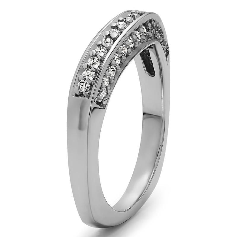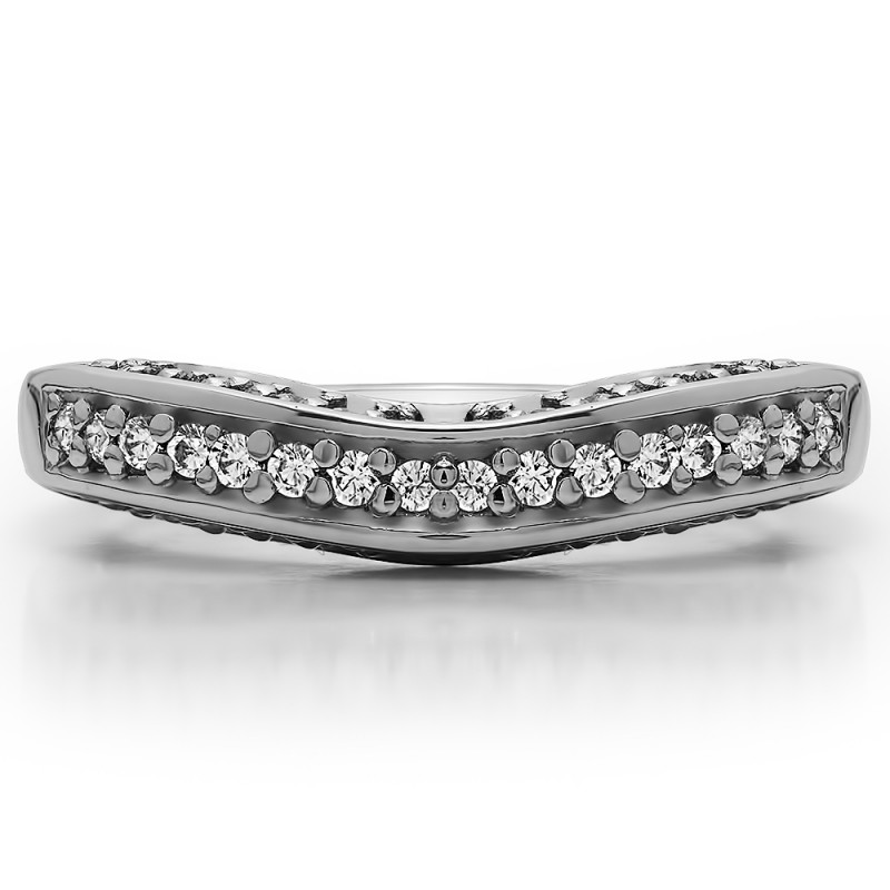 This curved wedding ring features 46 round, prong set stones with 0.35 carats in total. The ring is 2 millimeters wide and weighs approximately 6.55 grams. This contour band is made to fit a round or marquise solitaire from 1/2 carat up to 2 carats or a princess solitaire from 1/2 carat to 3/4 carat. Curved rings are perfect for most style engagement rings. If you are unsure what will fit with your engagement ring, please add Virtual Fit onto your order so we can email you images of our ring with yours for approval before shipping.