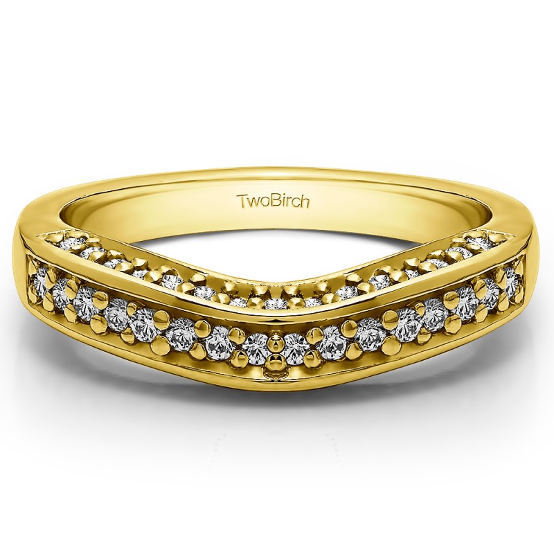This curved wedding ring features 46 round, prong set stones with 0.35 carats in total. The ring is 2 millimeters wide and weighs approximately 6.55 grams. This contour band is made to fit a round or marquise solitaire from 1/2 carat up to 2 carats or a princess solitaire from 1/2 carat to 3/4 carat. Curved rings are perfect for most style engagement rings. If you are unsure what will fit with your engagement ring, please add Virtual Fit onto your order so we can email you images of our ring with yours for approval before shipping.