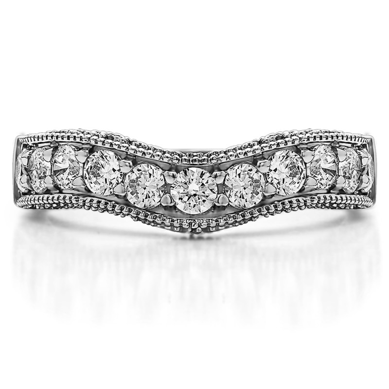 This curved wedding ring features 15 round, prong set stones with 0.75 carats in total. The ring is 2 millimeters wide and weighs approximately 5.48 grams. This contour band is made to fit a round solitaire from 0.5 carats up to 1 carats, a marquise solitaire from 0.25 carats up to 1 carats, or a princess cut solitaire from 0.5 carats up to 0.75 carats. Curved rings are perfect for most style engagement rings. If you are unsure what will fit with your engagement ring, please add Virtual Fit onto your order so we can email you images of our ring with yours for approval before shipping.