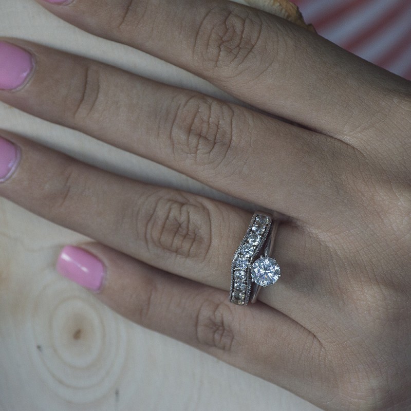This curved wedding ring features 15 round, prong set stones with 1 carats in total. The ring is 2 millimeters wide and weighs approximately 6.16 grams. This contour band is made to fit a round solitaire from 0.5 carats up to 1 carats, a marquise solitaire from 0.25 carats up to 1 carats, or a princess cut solitaire from 0.5 carats up to 0.75 carats. Curved rings are perfect for most style engagement rings. If you are unsure what will fit with your engagement ring, please add Virtual Fit onto your order so we can email you images of our ring with yours for approval before shipping.