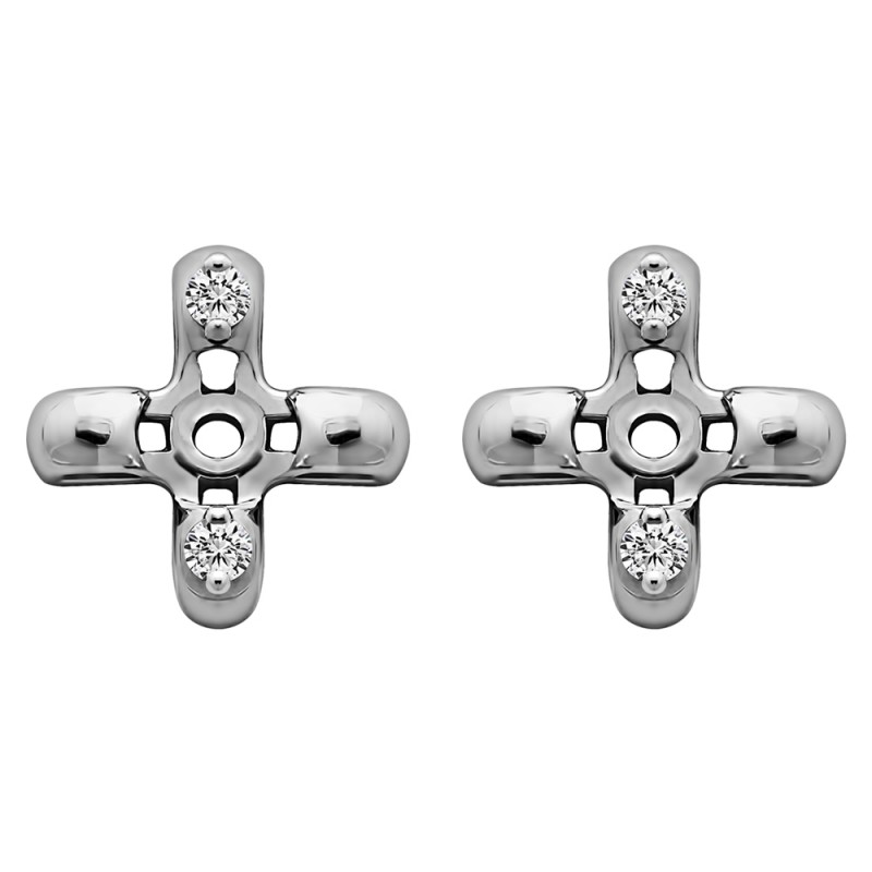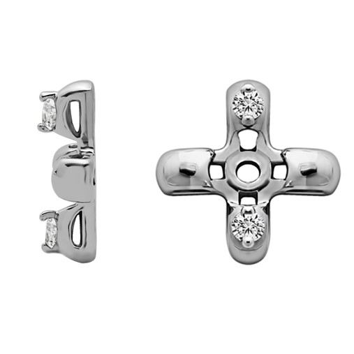 These earring jackets feature 4 round, prong set stones weighing 0.06 carats. Earring jackets are sold in pairs. They weigh approximately 2.1 grams. This pair of earring jackets will fit the following size studs (weights are per STONE carat weight, not PAIR of earrings carat weight):Made to fit a round stud earring from 0.15 up to 0.5 carats or a princess cut stud from 0.25 up to 0.75 carats (per stud).