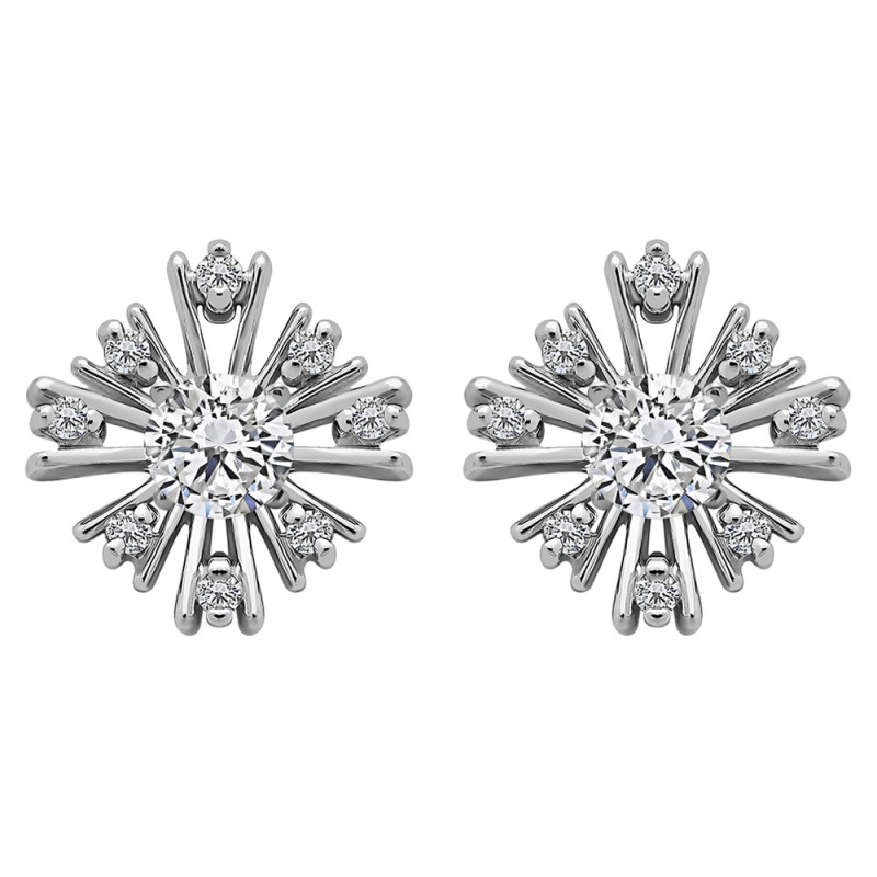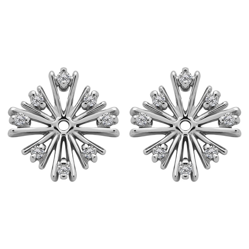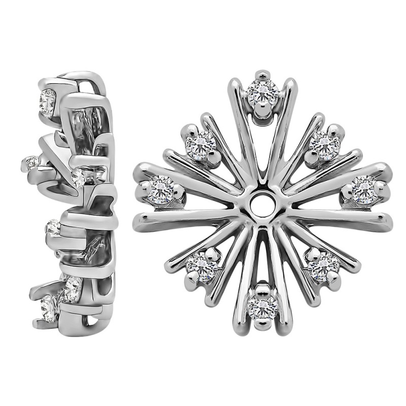 These earring jackets feature 16 round, prong set stones weighing 0.16 carats. Earring jackets are sold in pairs. They weigh approximately 2.72 grams. This pair of earring jackets will fit the following size studs (weights are per STONE carat weight, not PAIR of earrings carat weight):Made to fit a round stud earring from 0.15 up to 0.5 carats or a princess cut stud from 0.25 up to 0.75 carats (per stud).