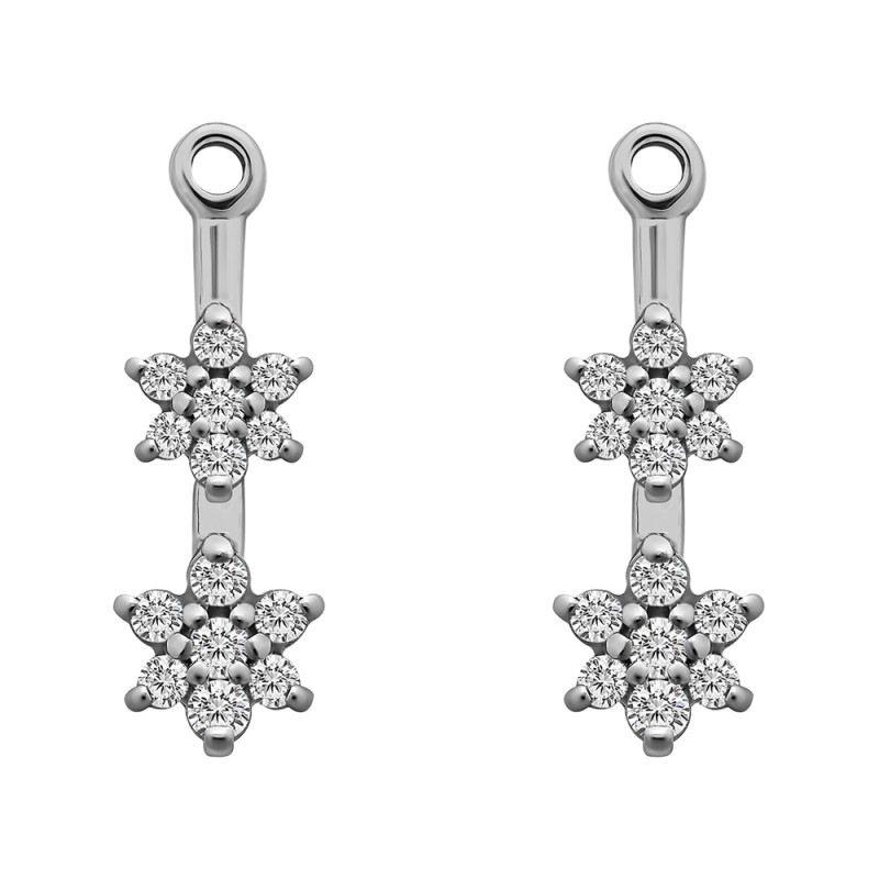 These earring jackets feature 28 round, prong set stones weighing 0.19 carats. Earring jackets are sold in pairs. They weigh approximately 1.32 grams. This pair of earring jackets will fit the following size studs (weights are per STONE carat weight, not PAIR of earrings carat weight):Made to fit a round stud earring from 0.15 up to 0.25 carats or a princess cut stud from 0.25 up to 0.3 carats (per stud).